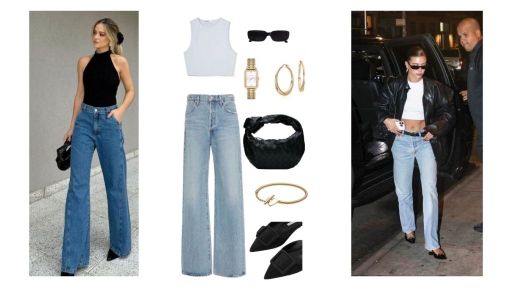 - A casual model-off-duty moment. Crisp white or effortless black top, chic sunnies, and these shoes peeking out a pair of jeans. Hailey Bieber styled a similar look in NYC (June 2023), adding an oversized black leather jacket.