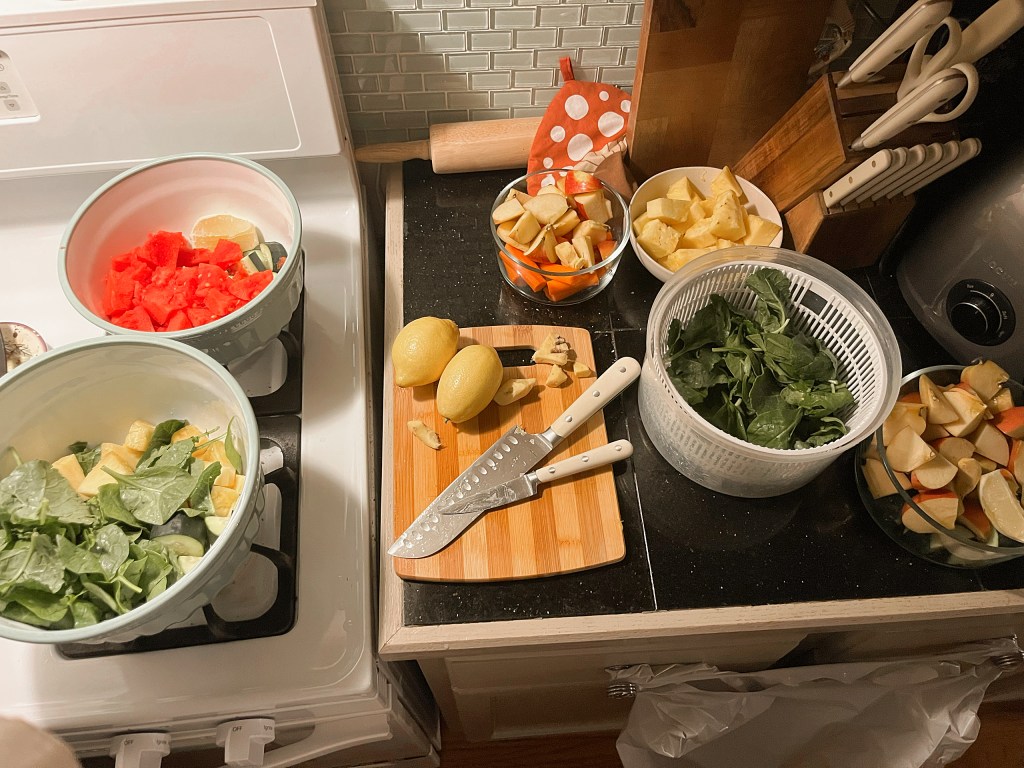 Chopping all the fruits and veggies. Creating colorful bowls.